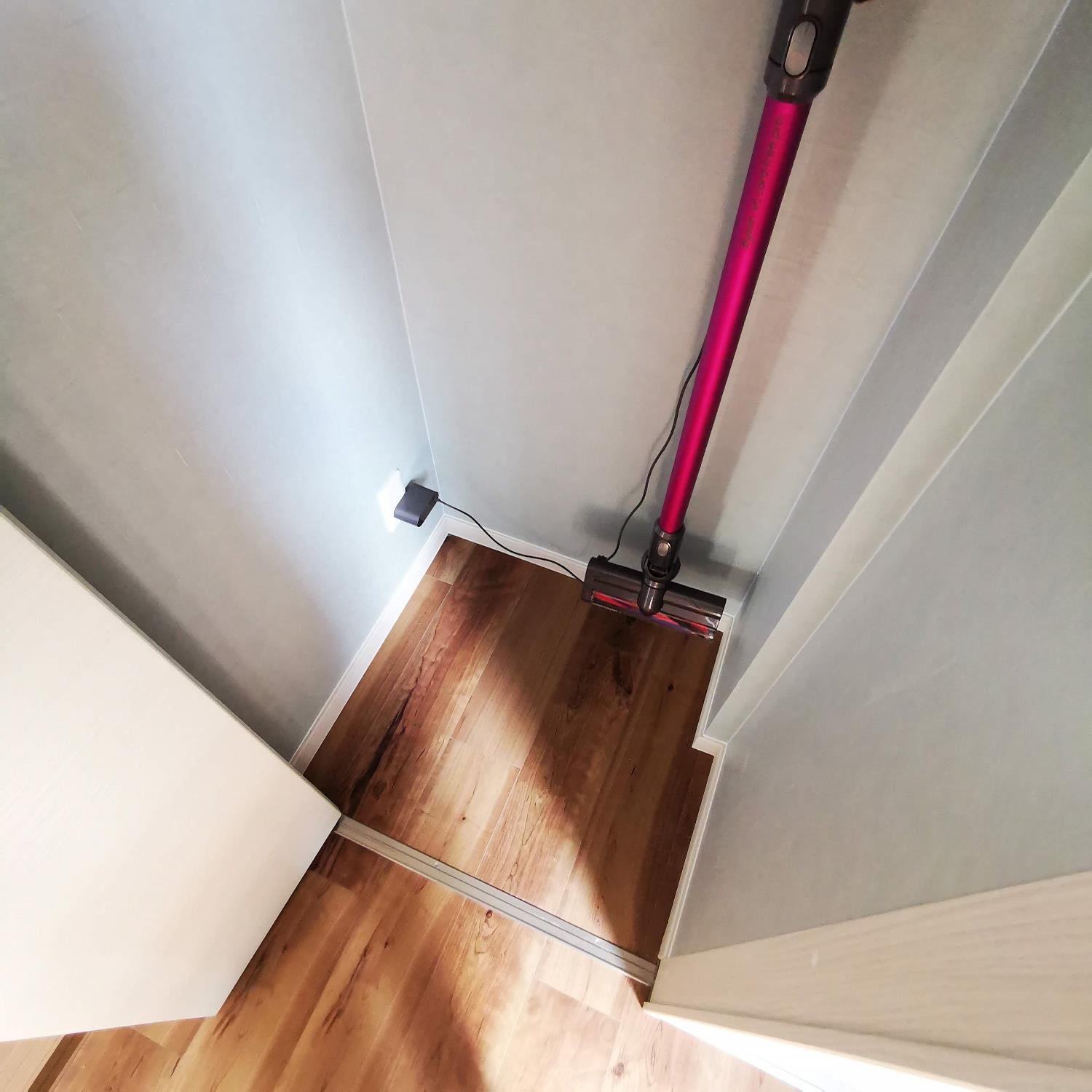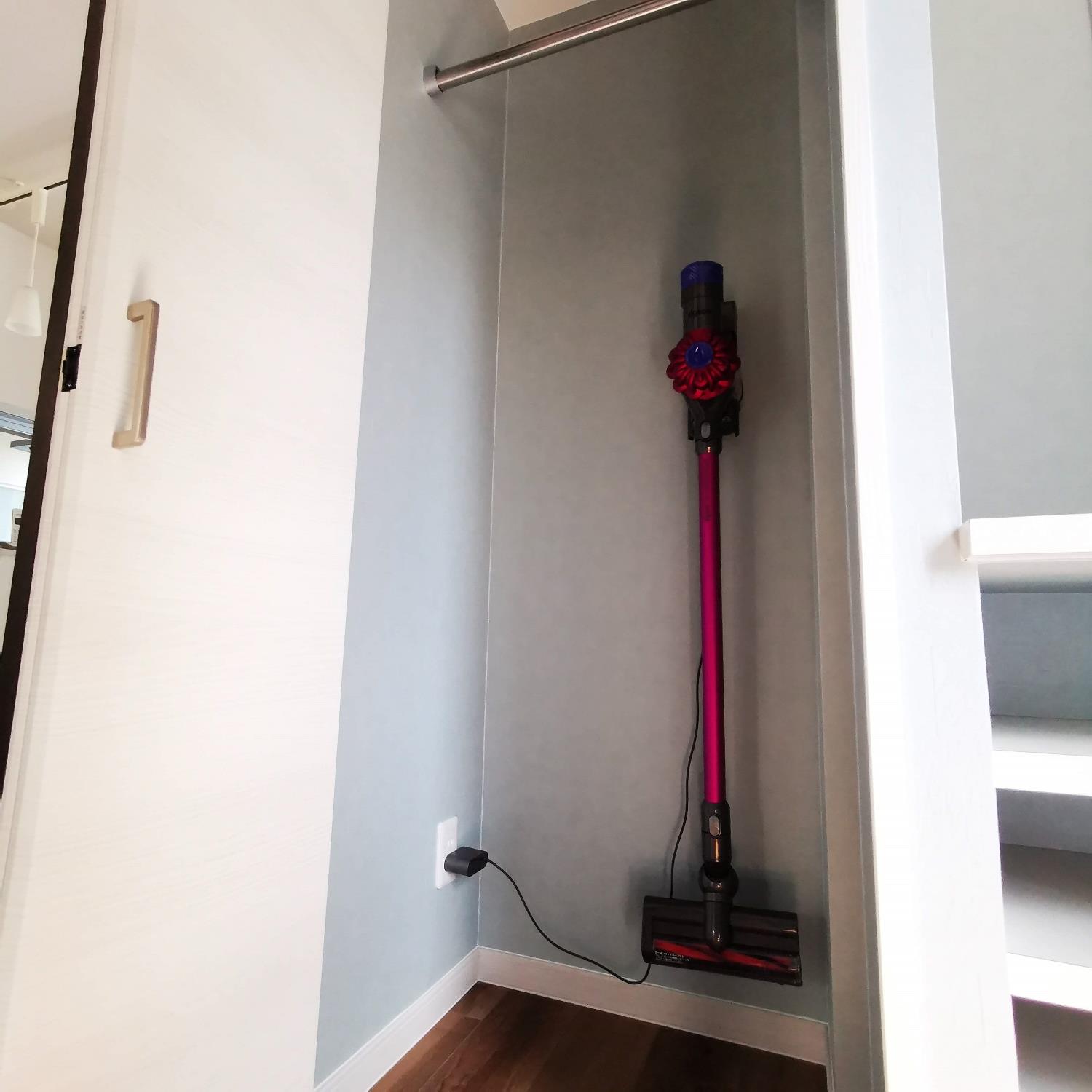 - ダイソンの掃除機も玄関クローゼットに収納し、そのまま充電可能に
