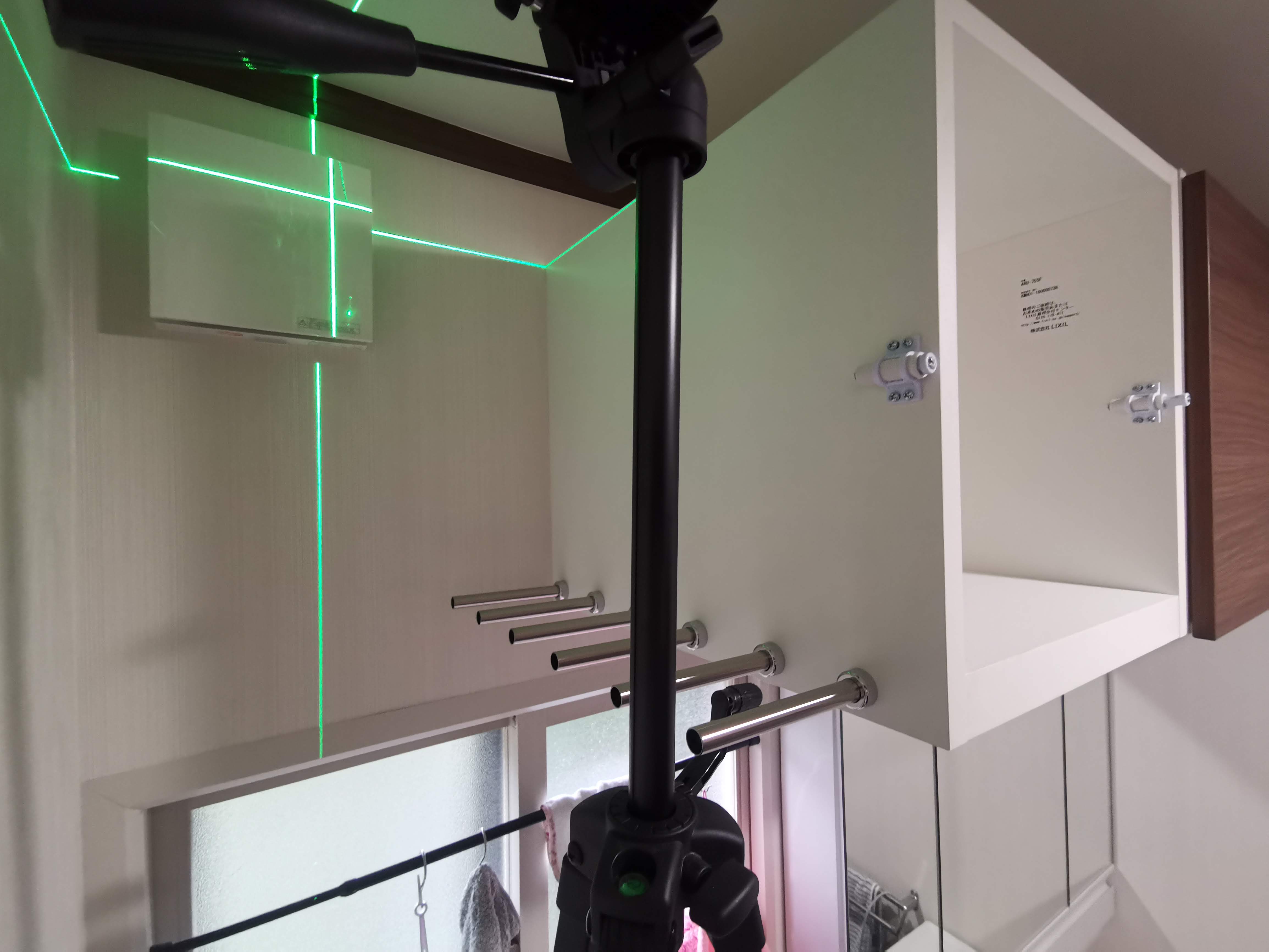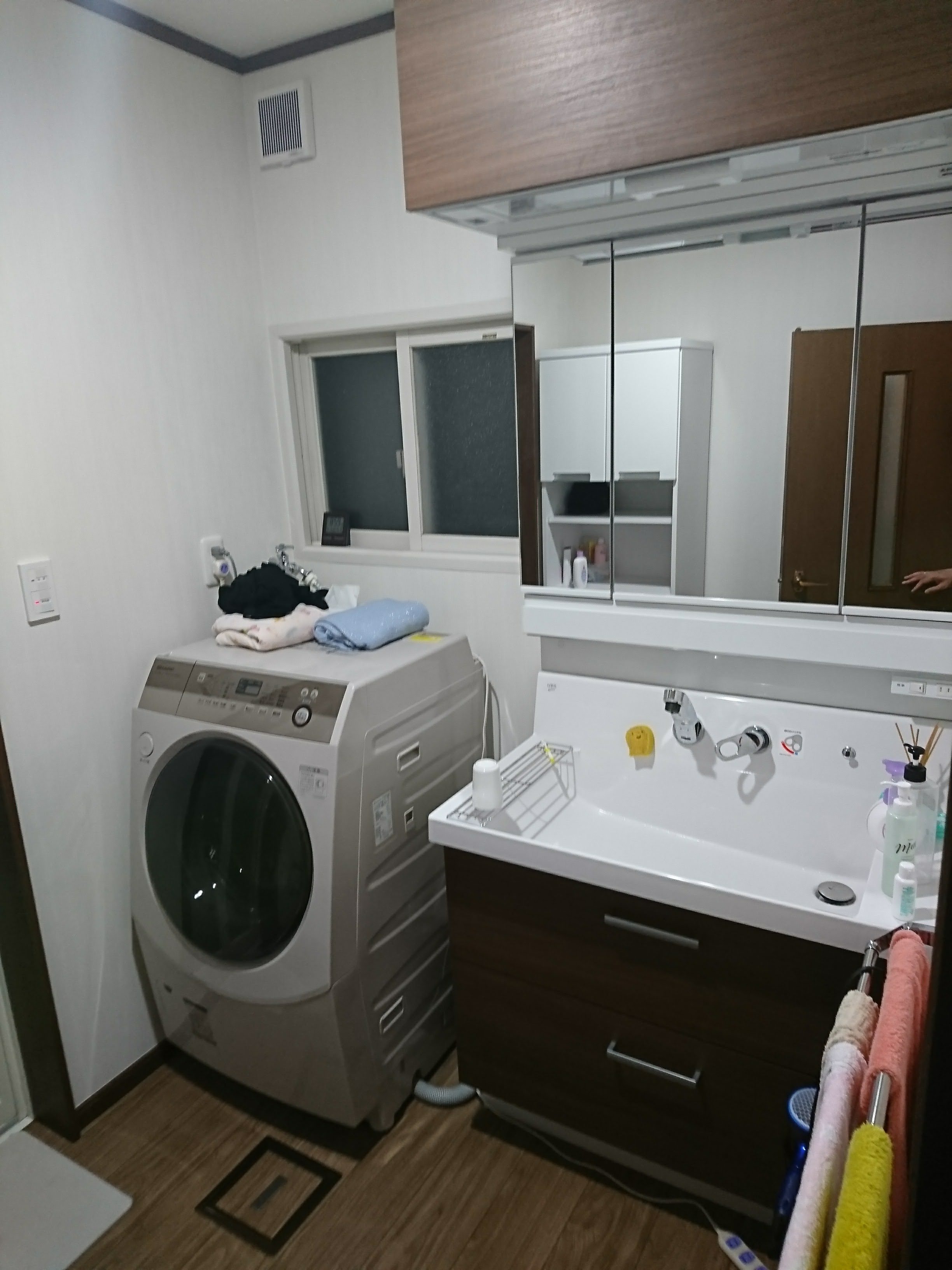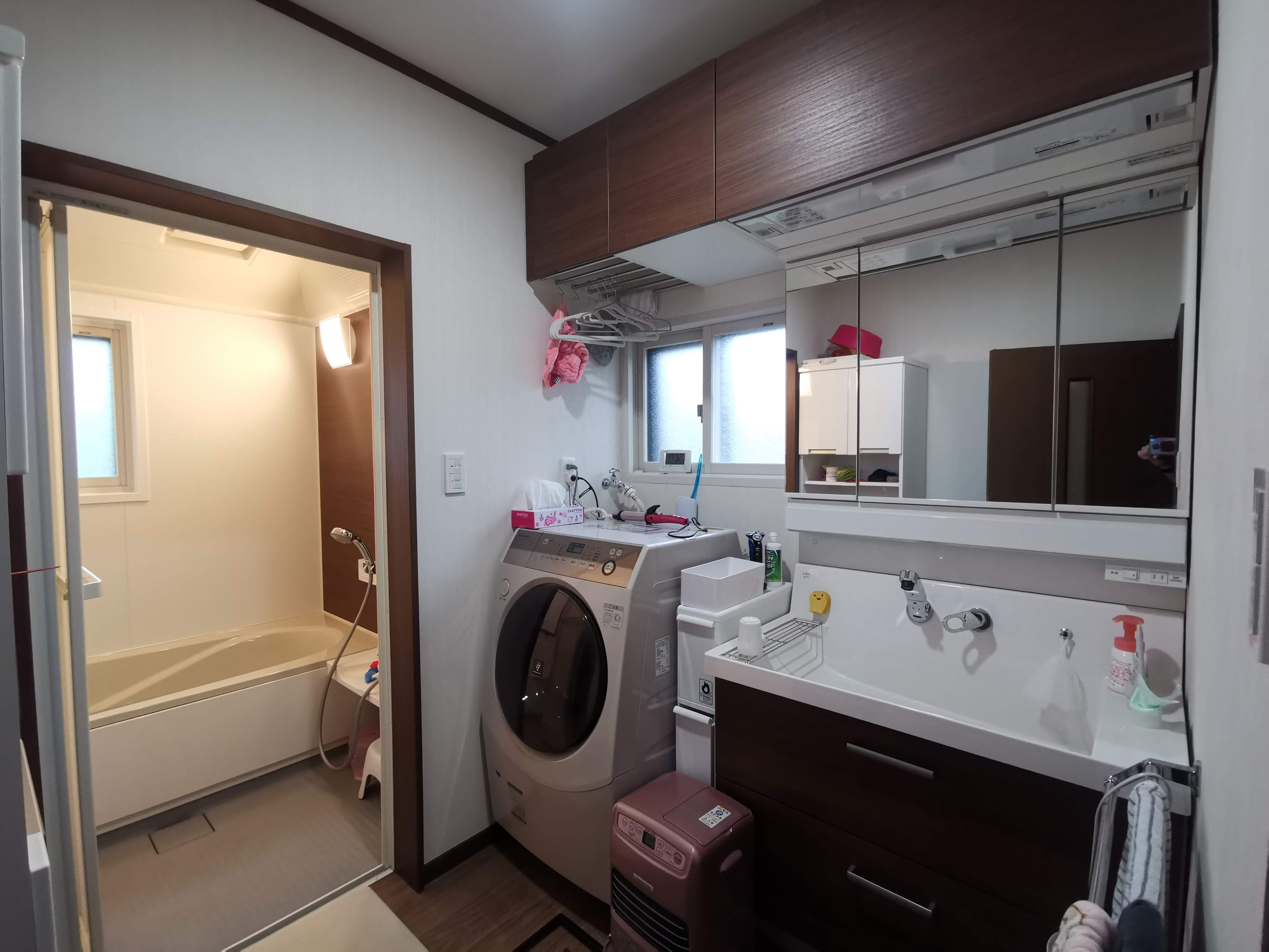 次回は、この背面のサニタリーチェストを別の物に交換し、頭上に棚を設け、その下にクローゼットパイプを取り付けることで、洗濯物を干せる場所を大幅に増やそう考えております。干渉してくるドアをアウトセット引戸にするという事も考えています。
